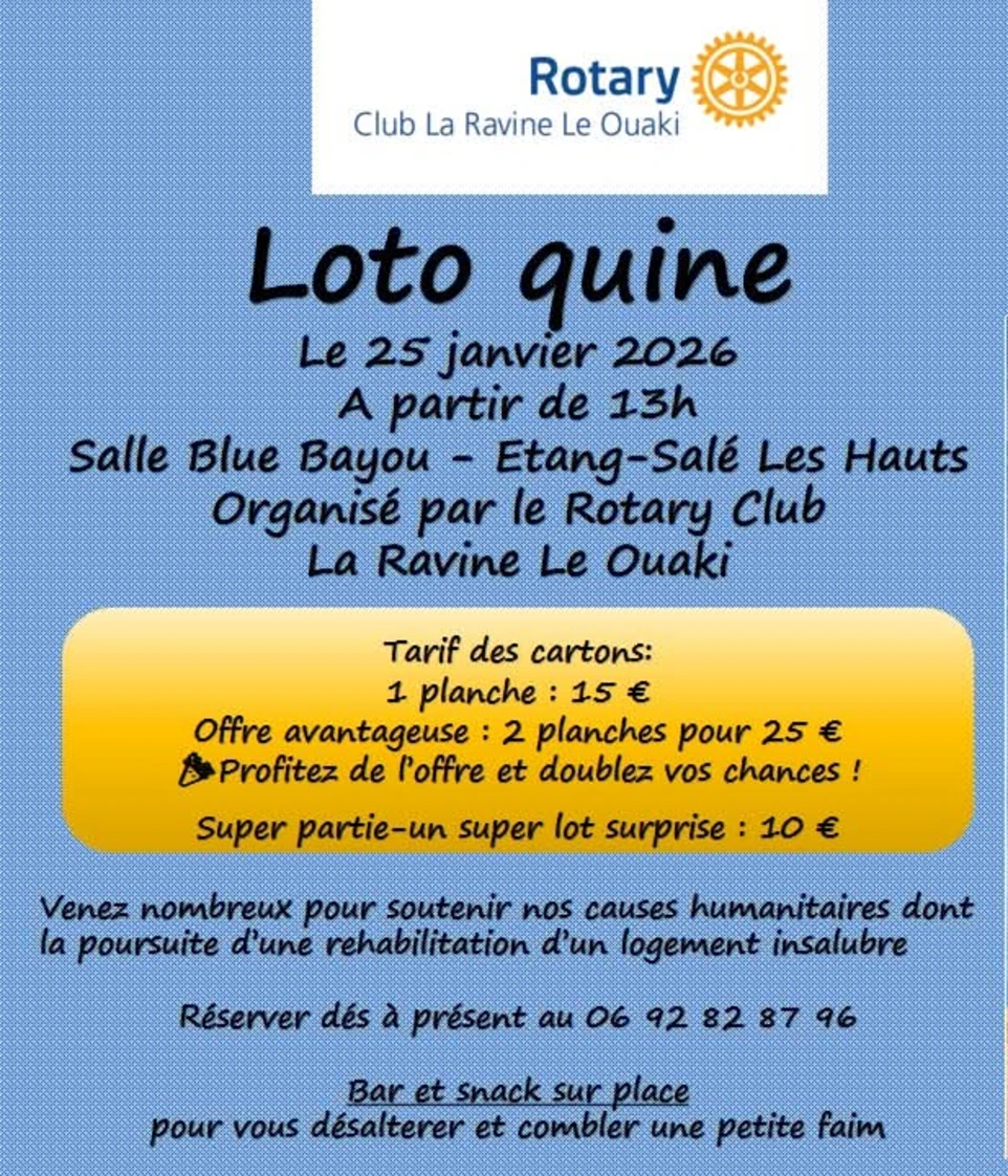 Le Rotary Club La Ravine Le Ouaki rassemble des bénévoles qui s’engagent, chacun à leur manière, pour des causes variées : solidarité, santé, éducation, aide humanitaire ou prévention.